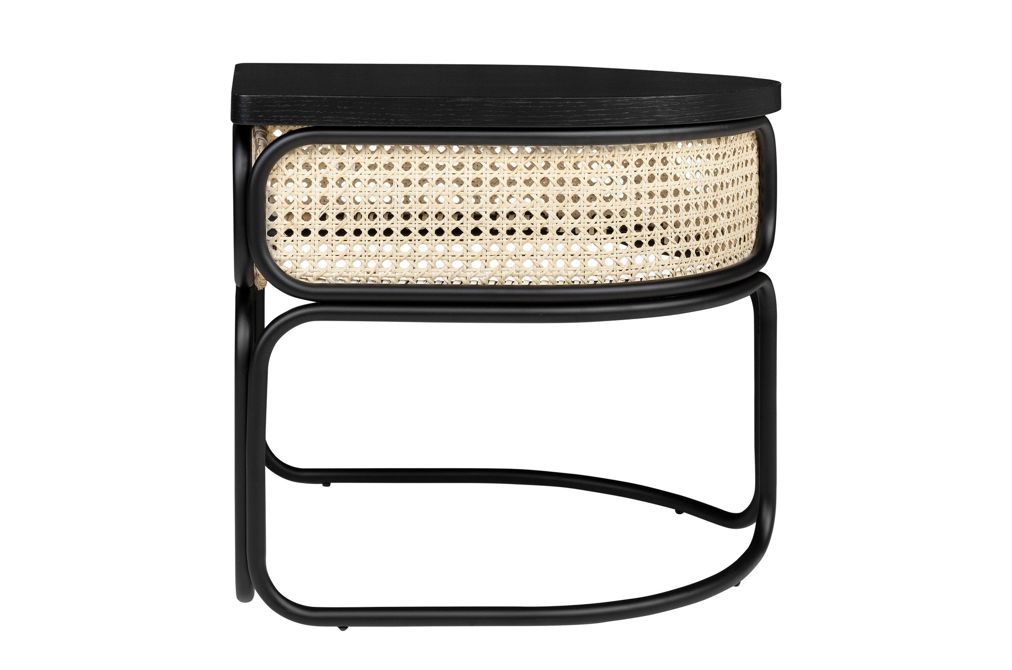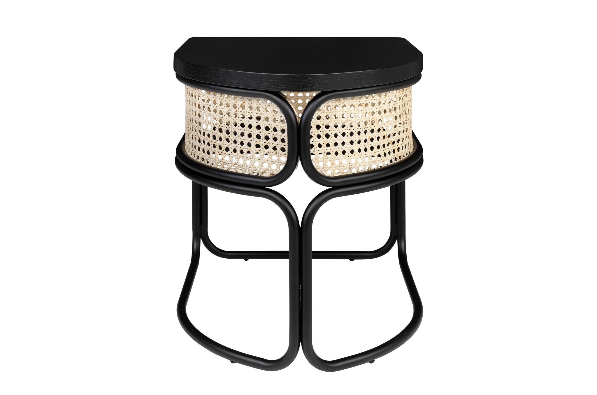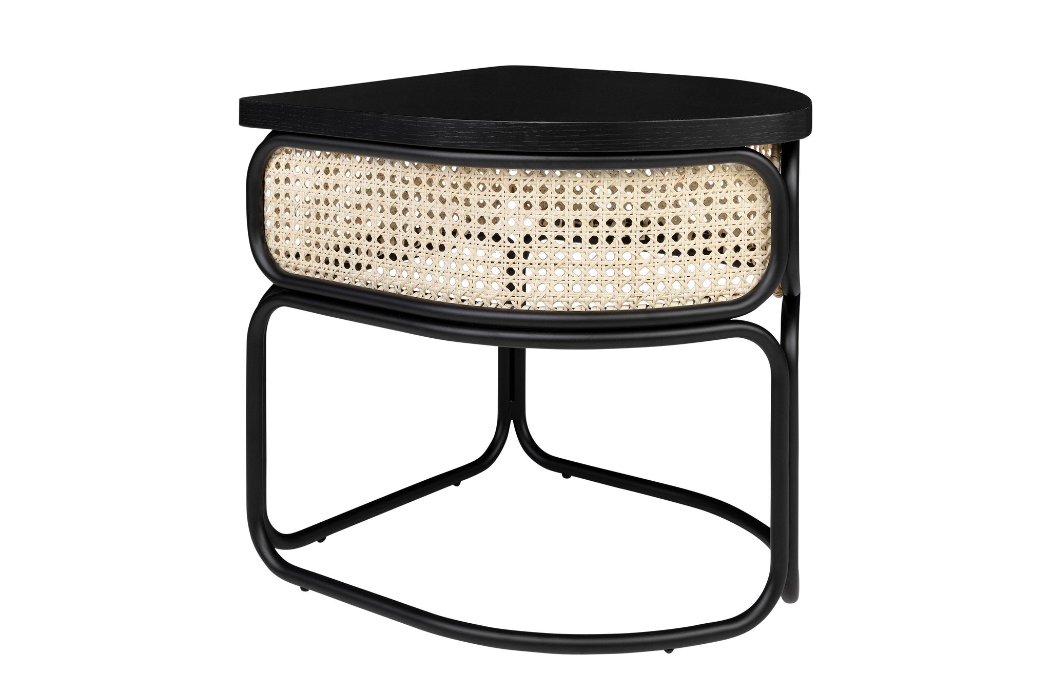 Bijzettafel Hoops van Versmissen brengt een fijne mix van rotan en metaal samen in een ontwerp dat licht oogt, maar toch karakter heeft. Het zwarte frame zorgt voor een rustige basis, terwijl het rotanpaneel en het eikenfineer blad warmte toevoegen.