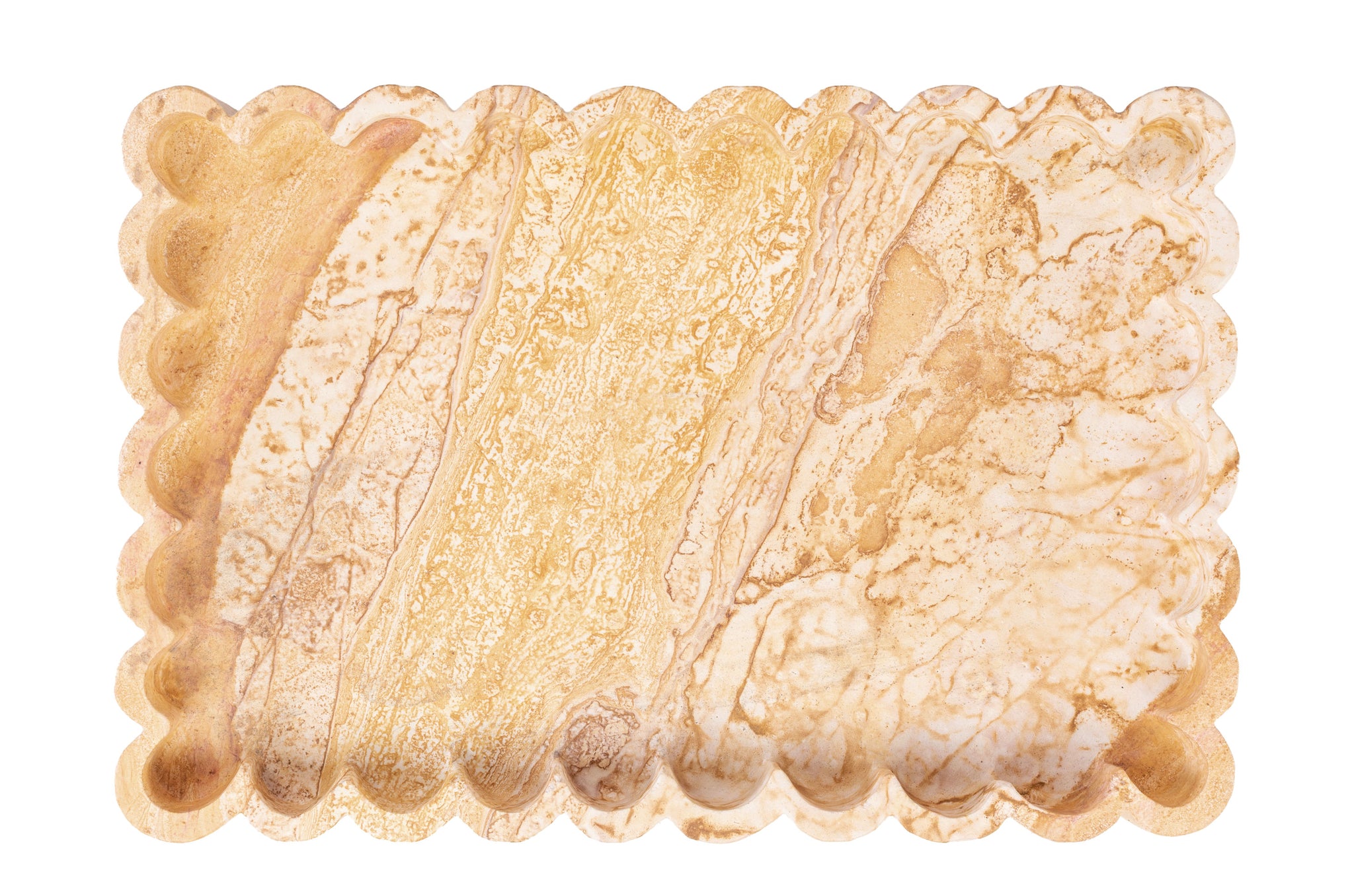 Plateau Petal van Vermissen is een sculpturaal statementstuk, volledig uit zandsteen gehouwen. De organische, bloemvormige rand geeft het plateau een zachte, bijna handgevormde uitstraling, terwijl het gelaagde kleurenpalet van zand-, crème- en honingtonen elke uitvoering een eigen karakter geeft. De matte afwerking benadrukt de natuurlijke steenstructuur en zorgt voor een ingetogen, elegante look.