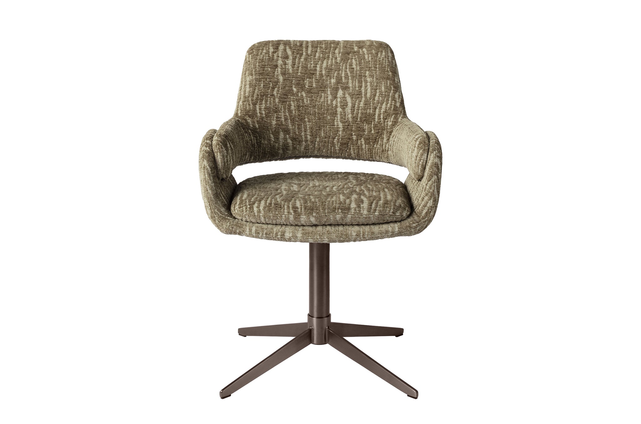 Het elegante onderstel in geborsteld brons voegt een verfijnde glans toe en vormt een mooi contrast met de textuur van de stof. Dankzij de duurzame samenstelling en een slijtvastheid van 45.000 Martindale is deze stoel ontworpen voor intensief gebruik, zonder aan stijl in te leveren.