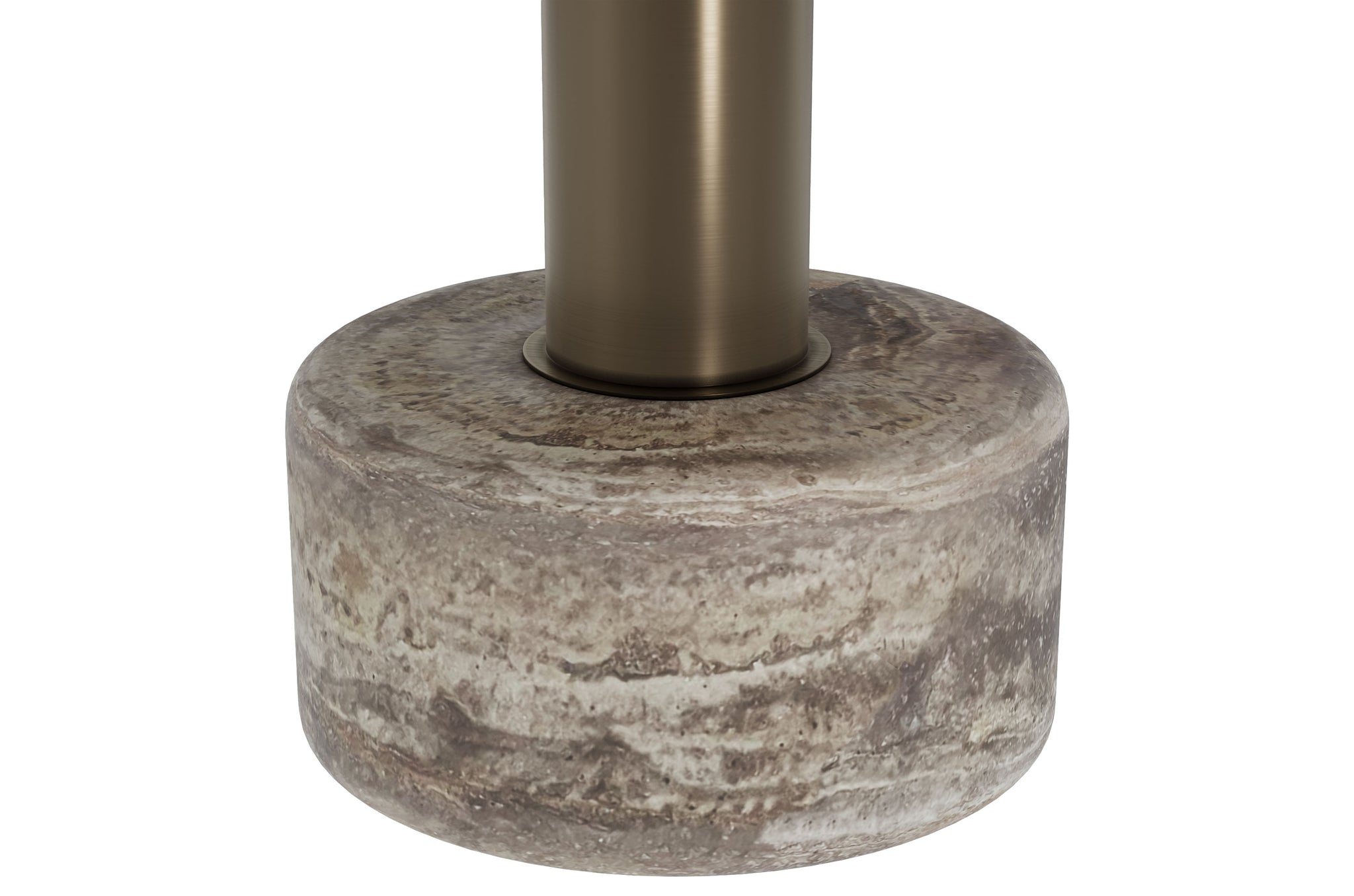Salontafel Cooper draait om materiaalbeleving. Het ronde blad en de massieve voet zijn uitgevoerd in grijs travertijn, met die kenmerkende natuurlijke tekening die elke tafel een eigen karakter geeft. Tussen blad en basis zit een slanke kolom van roestvrij staal, afgewerkt in geborsteld brons voor een warme, luxe uitstraling.