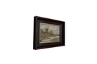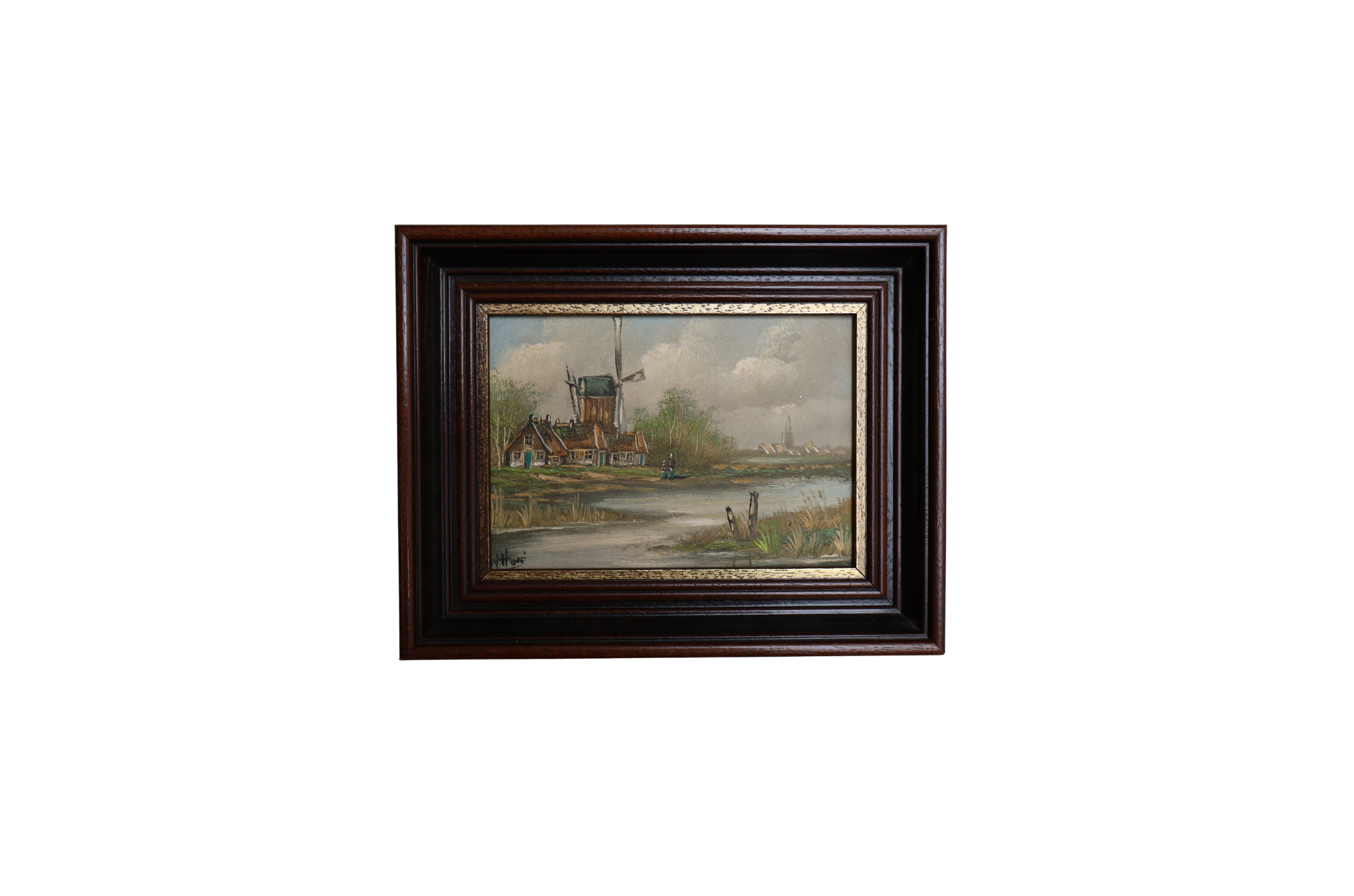 Deze set bestaat uit twee bij elkaar horende landschapsschilderijen, uitgevoerd door dezelfde kunstenaar en geplaatst in identieke, klassieke houten lijsten met vergulde binnenrand. De werken tonen karakteristieke Hollandse landschappen met boerderijen, water en een molen, geschilderd in een realistisch-impressionistische stijl.