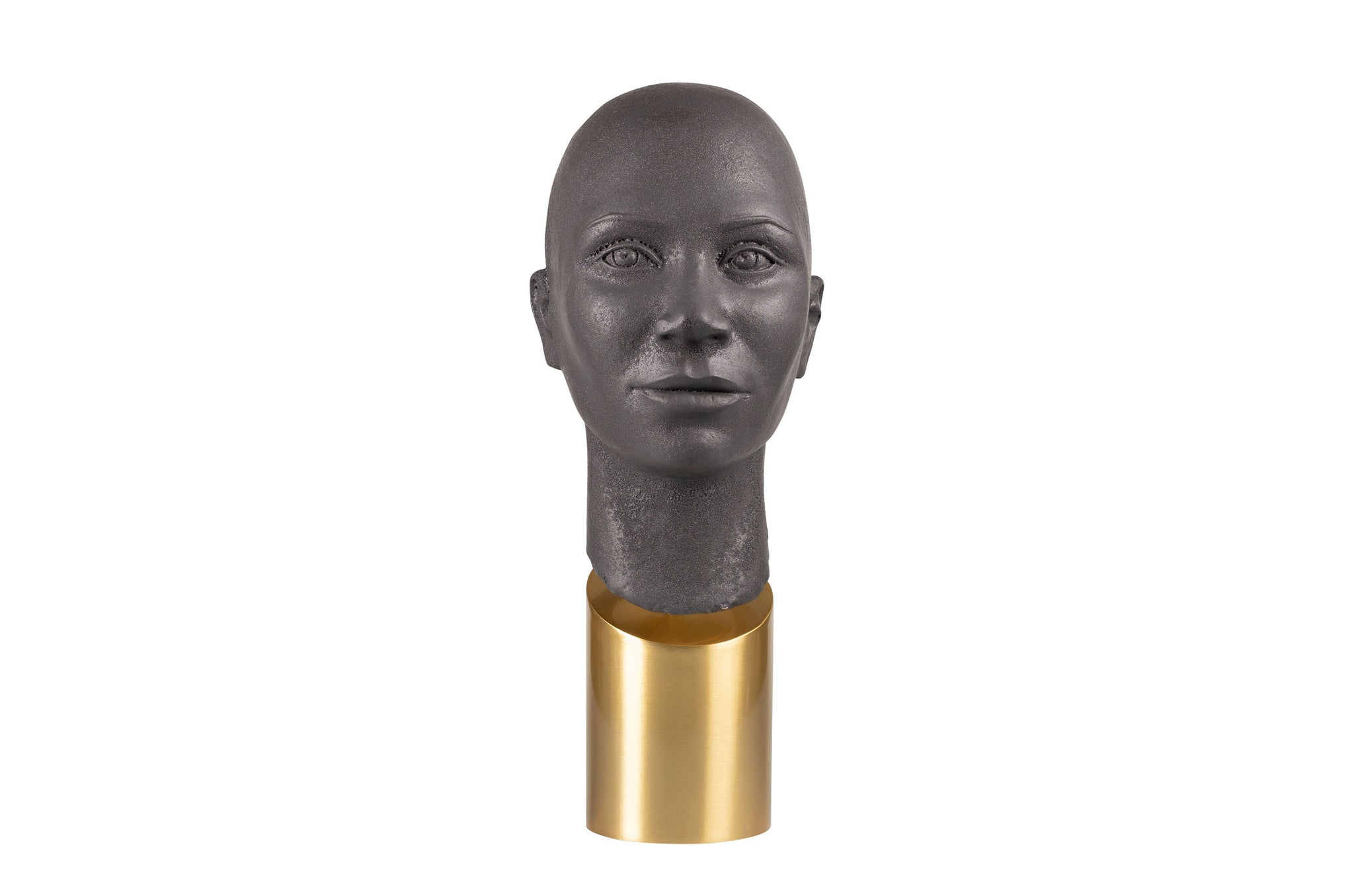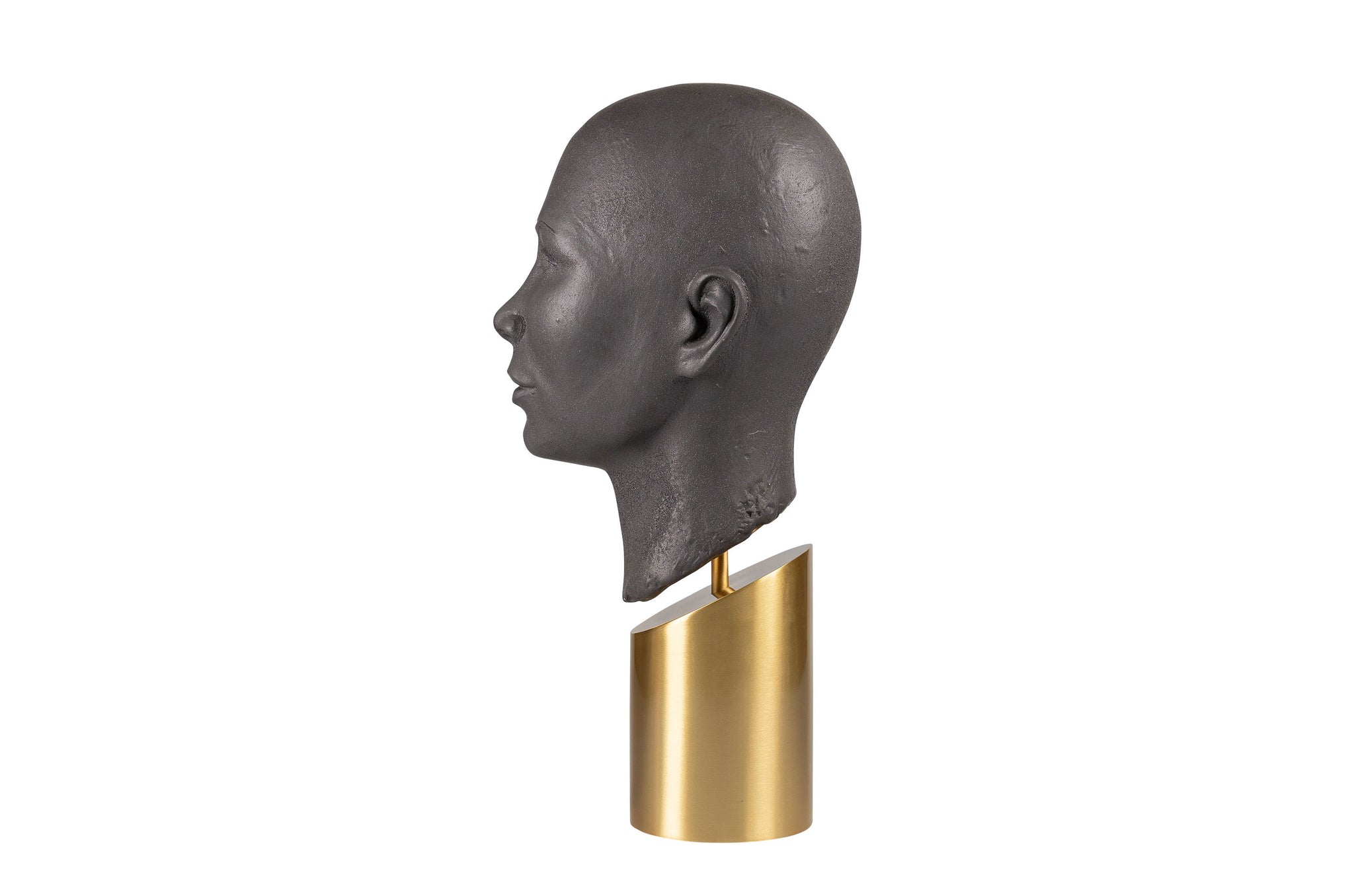 Beeld Conca op messing voet van Vermissen heeft een rustige, ingetogen uitstraling. De donkerbruine kop, uitgevoerd in aardewerk, toont een subtiele textuur die het gezicht diepte en karakter geeft. De messing voet vormt een warm en helder contrast en zorgt ervoor dat het beeld stevig en evenwichtig in de ruimte staat.