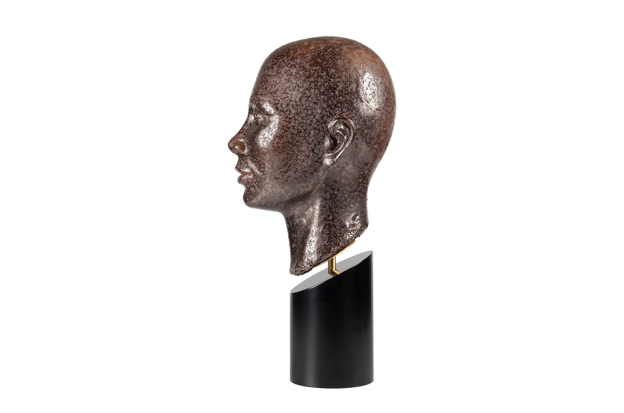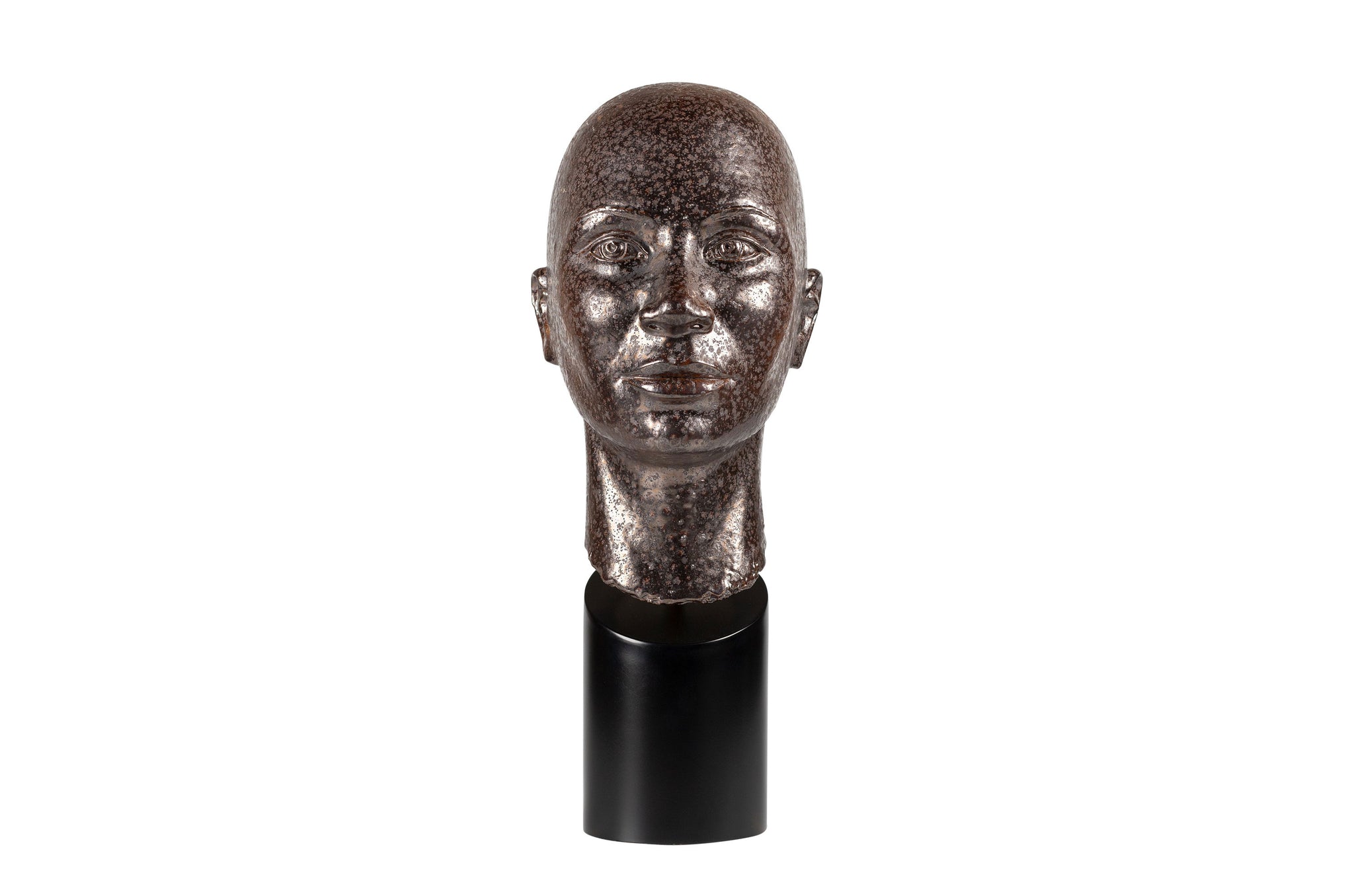 Beeld Conca van Vermissen heeft een rustige, bijna ingetogen uitstraling. De kop is vervaardigd uit aardewerk en afgewerkt in een warme bronstint met een licht gespikkeld oppervlak, wat het gezicht natuurlijke diepte en een subtiel spel van textuur geeft.