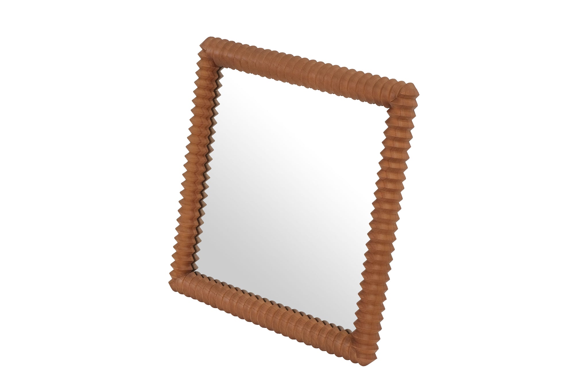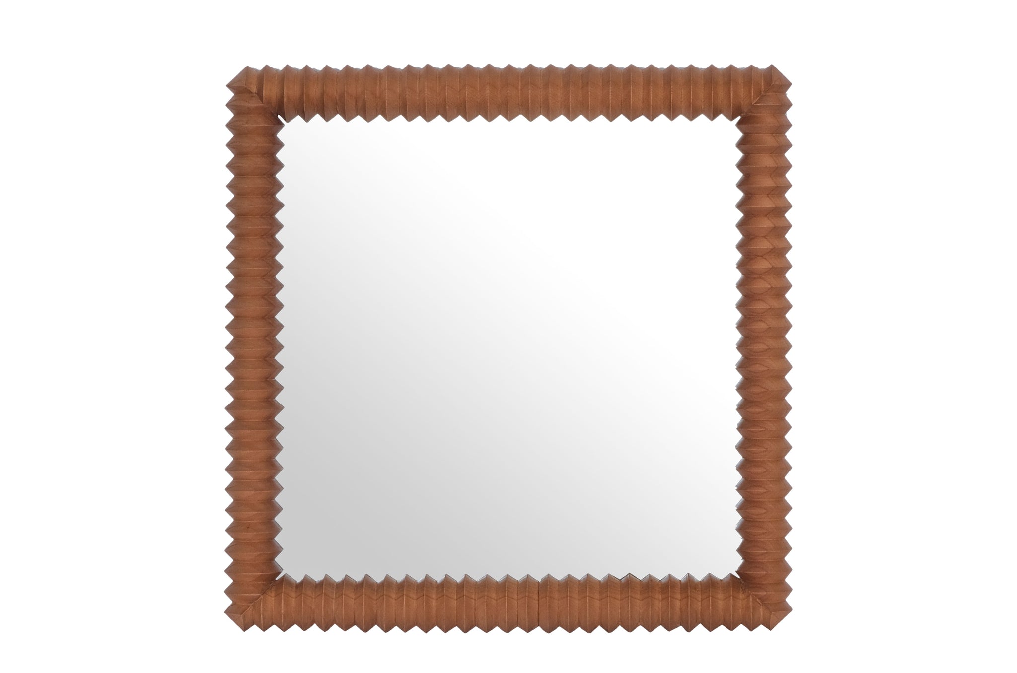 Spiegel Kiko valt direct op door zijn bijzondere lijst van mindihout in een warme amberkleur. De verfijnde, gevouwen structuur geeft het ontwerp extra diepte, zonder dat het druk wordt. Een stijlvolle blikvanger die net genoeg karakter toevoegt aan je muur, of je ’m nu solo ophangt of in een wandcompositie combineert.
