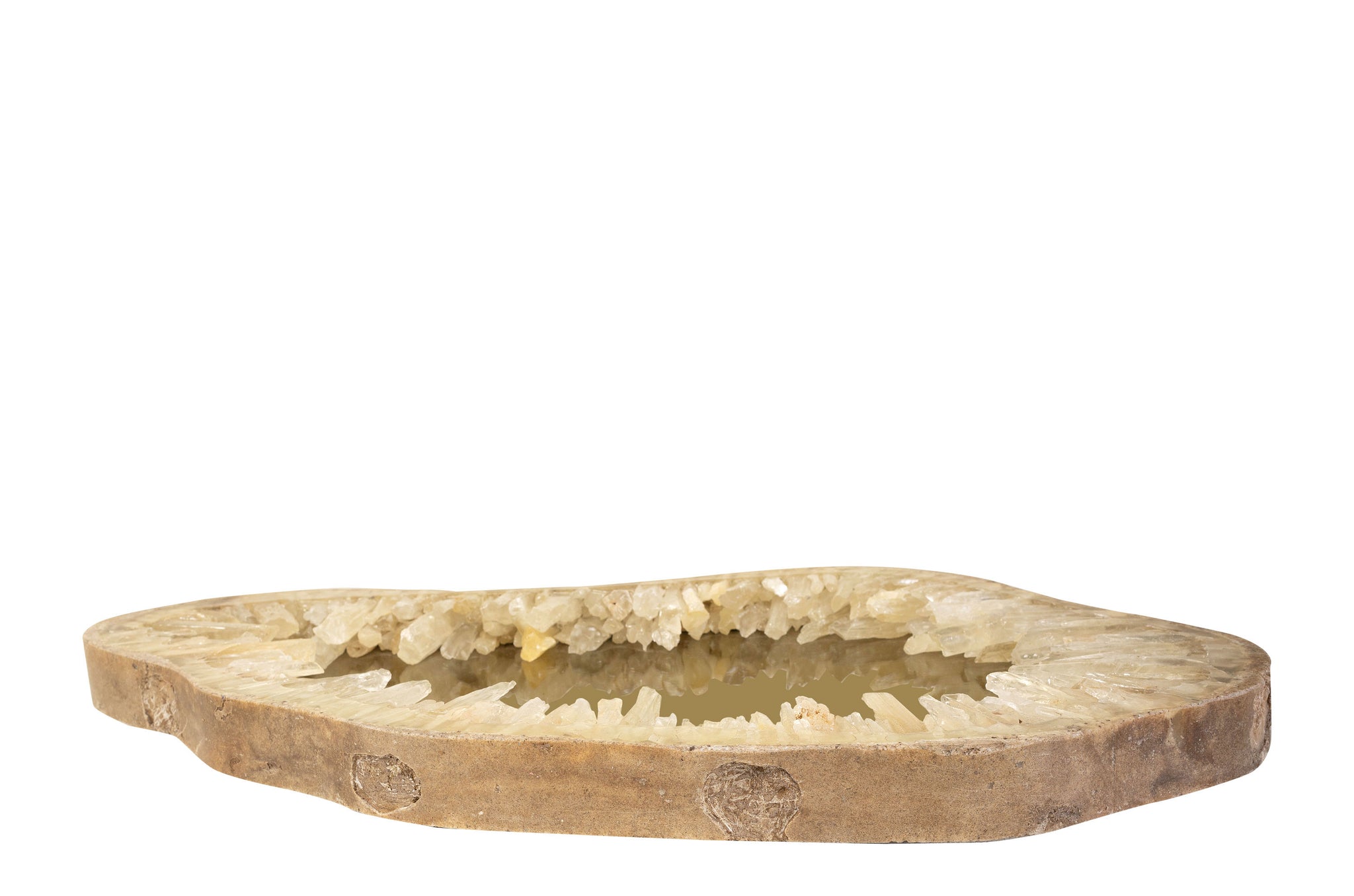 Spiegel Quartz valt direct op door zijn organische vorm en de rand van natuurlijke kwartskristallen. Elk stuk is uniek: de kristallen verschillen subtiel in kleur, formaat en structuur, waardoor de spiegel een bijna sculpturaal karakter krijgt.
