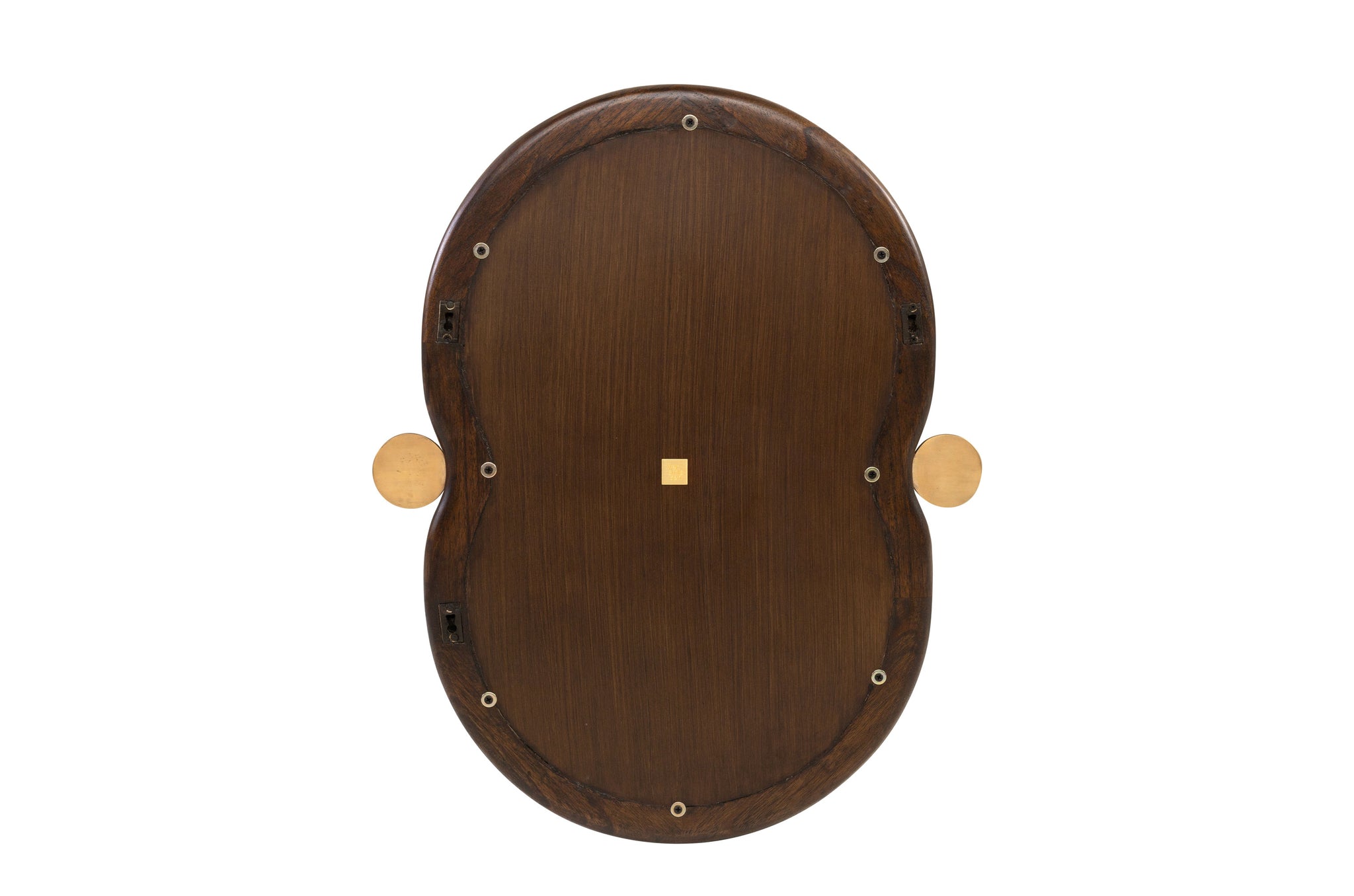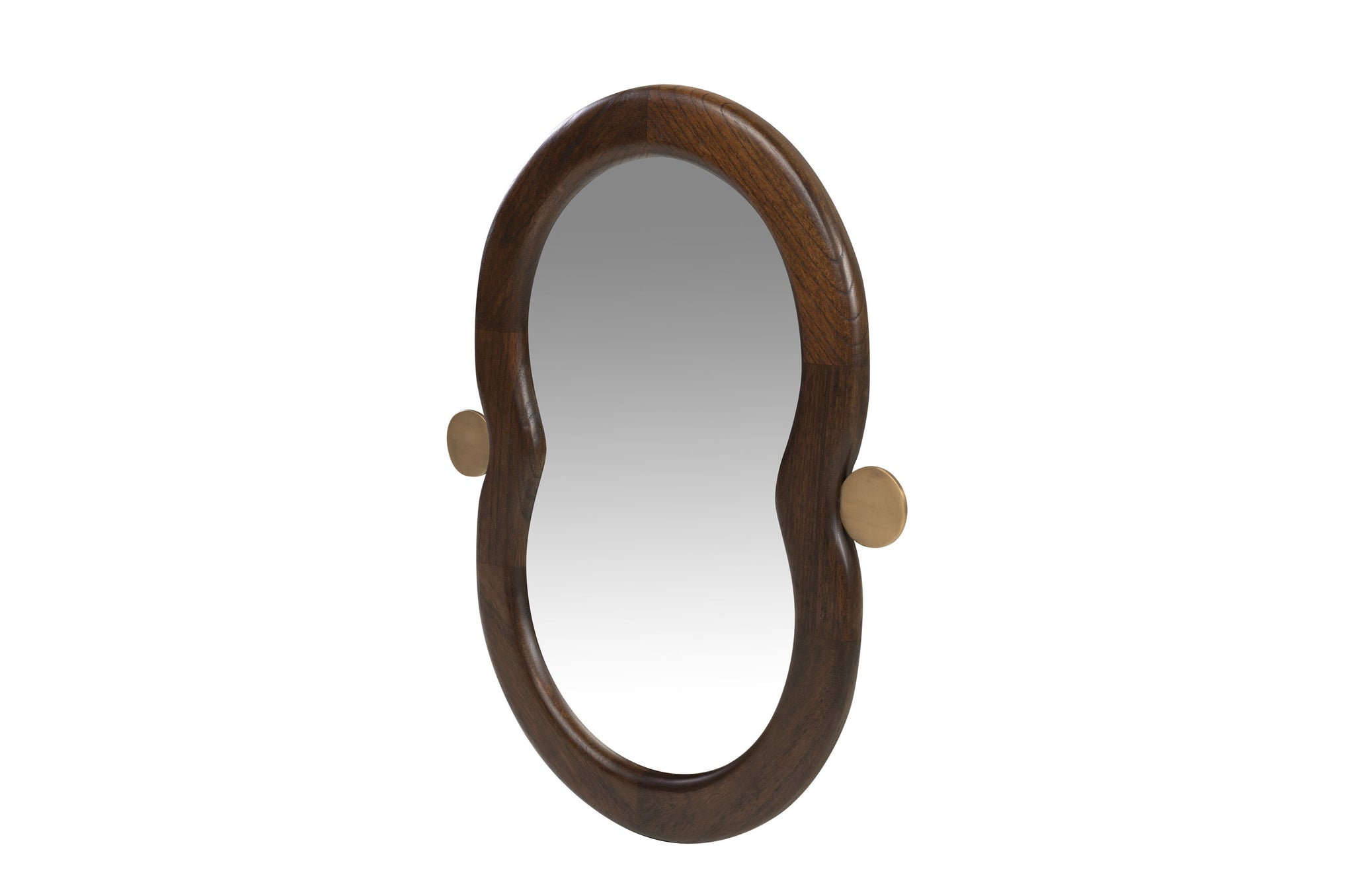 Spiegel Touma valt direct op door zijn organische vorm en elegante details. De lijst is gemaakt van mindihout in een diepe Roasted Coffee-tint, waardoor het hout mooi warm en vol oogt. Aan weerszijden zorgen twee subtiele messing accenten voor een vleugje luxe en balans.
