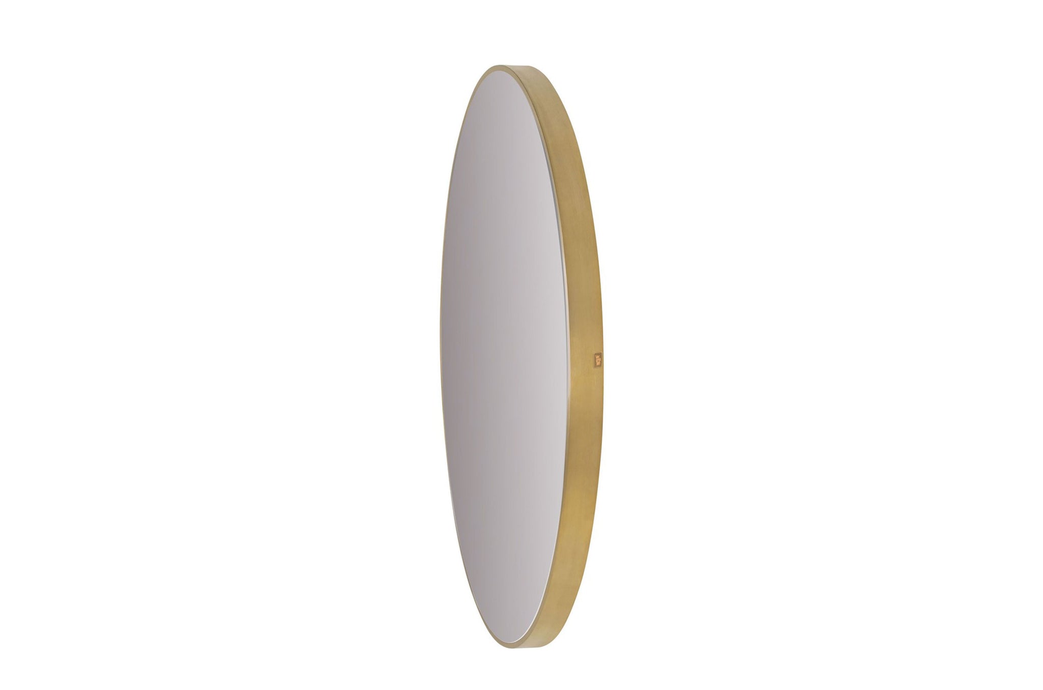 Ronde spiegel met slank brushed gold frame en minimalistisch design.