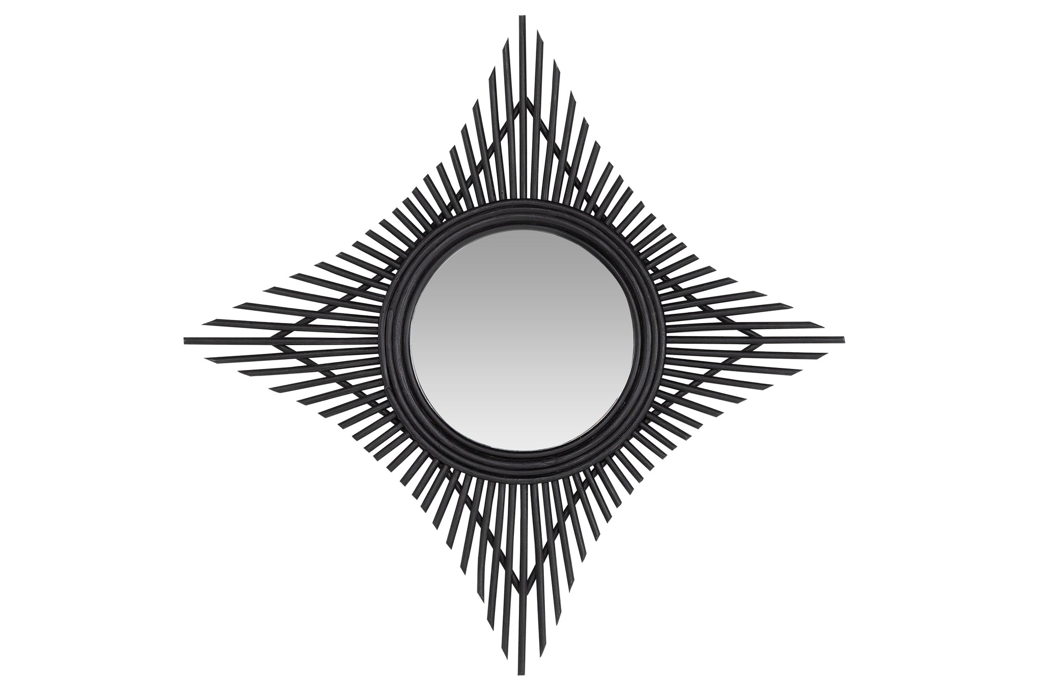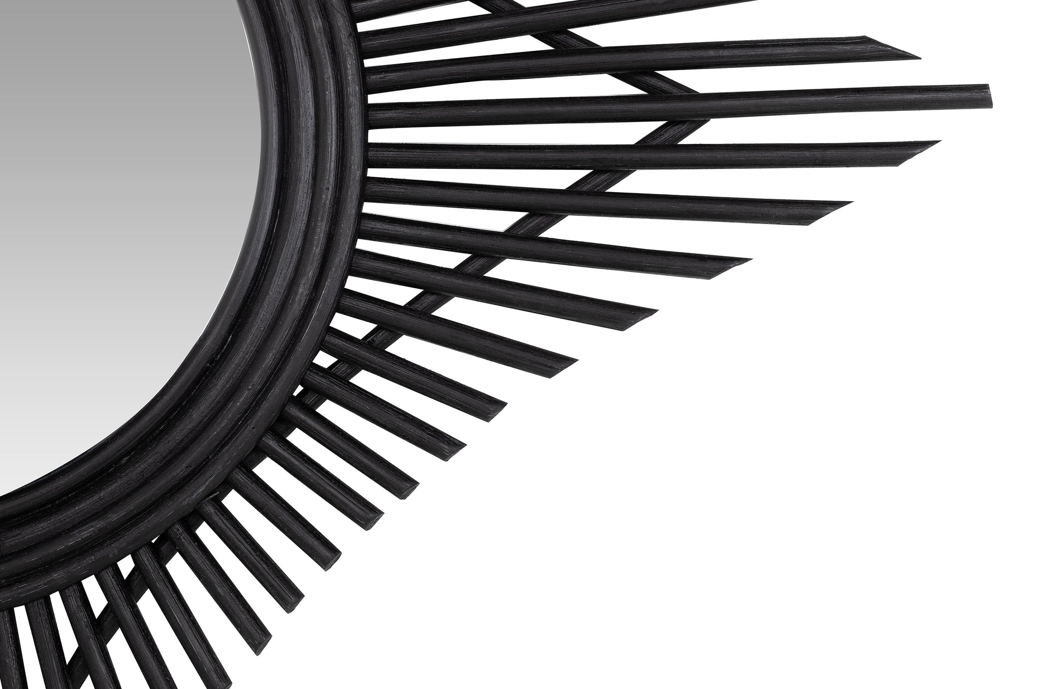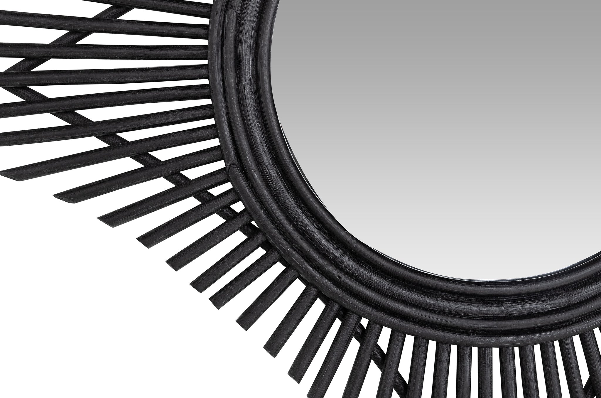 Zwarte wandspiegel van rotan met speels uitstralende stokken.
