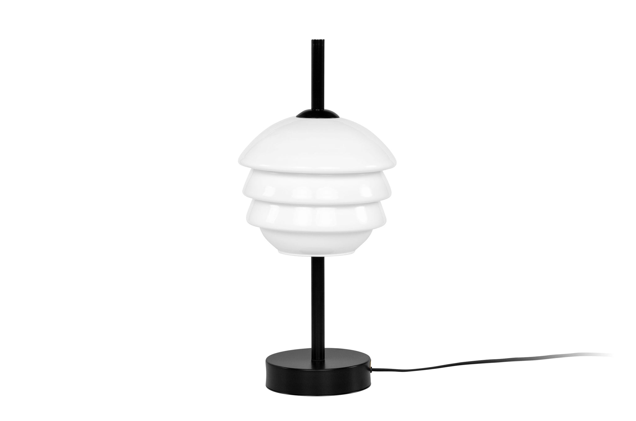 De tafellamp Louis van Versmissen is uitgevoerd in mondgeblazen opaalglas en heeft een helder, gelaagd silhouet. De zachte, witte glaslagen zorgen voor een gelijkmatige en diffuse lichtverspreiding, terwijl de zwarte voet en staander het ontwerp een grafisch contrast geven.