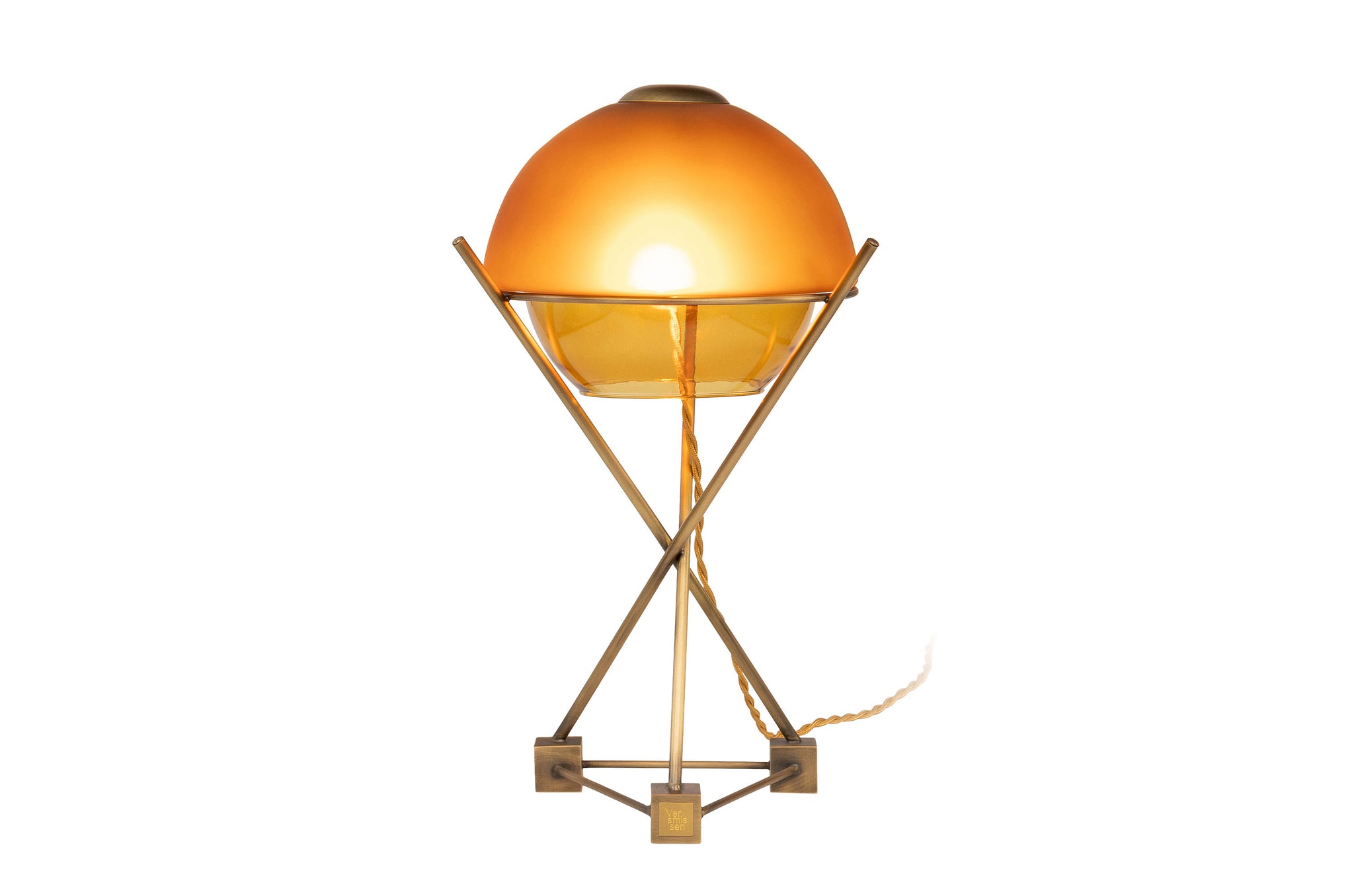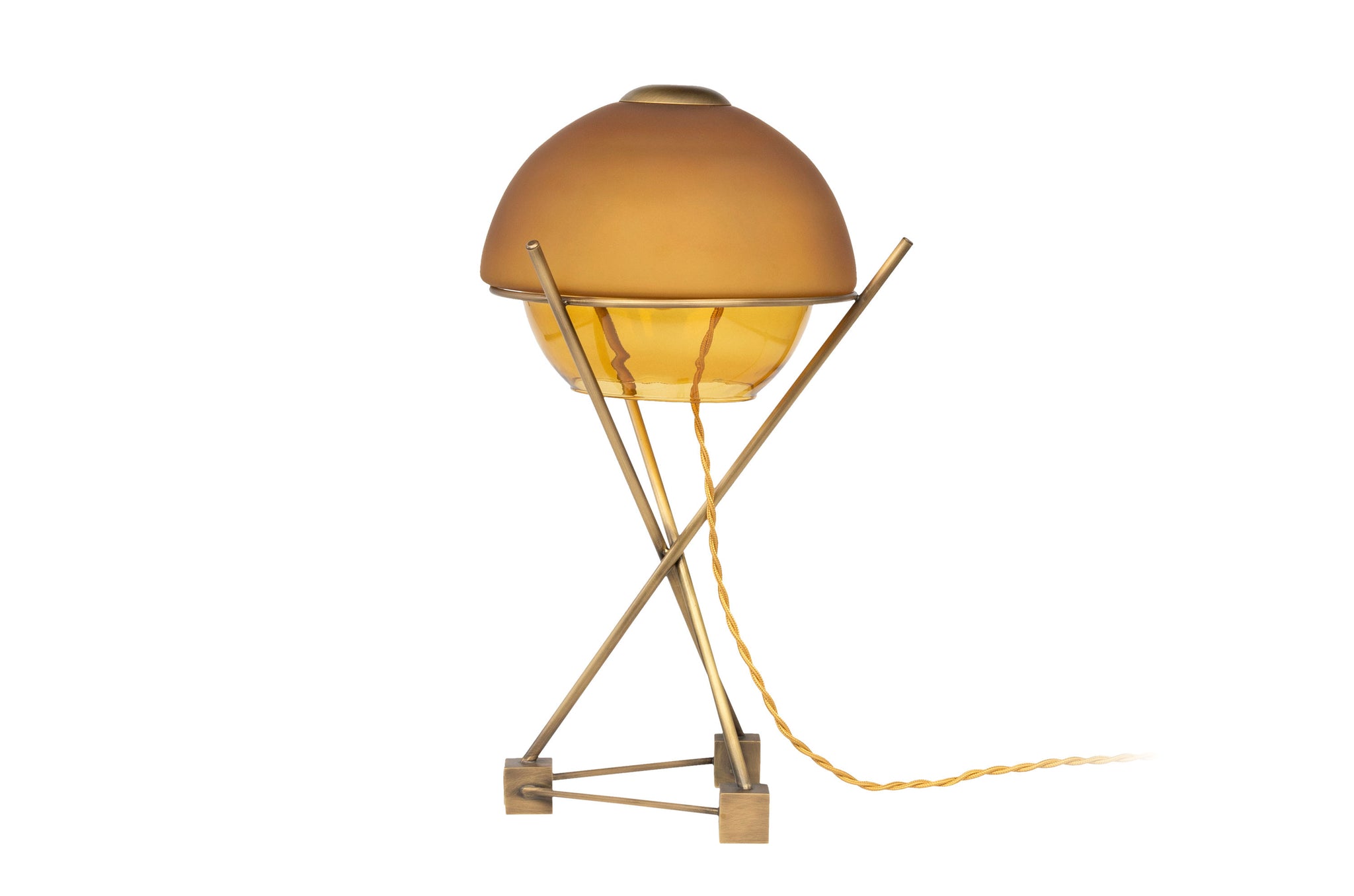 Tafellamp Lucie combineert mondgeblazen glas met een verfijnd frame van massief messing. De glazen kap is uitgevoerd in een warme caramelkleur, die het licht zacht filtert en zorgt voor een aangename, sfeervolle gloed. Door het mondgeblazen proces heeft iedere kap subtiele variaties, wat elke lamp een eigen karakter geeft.