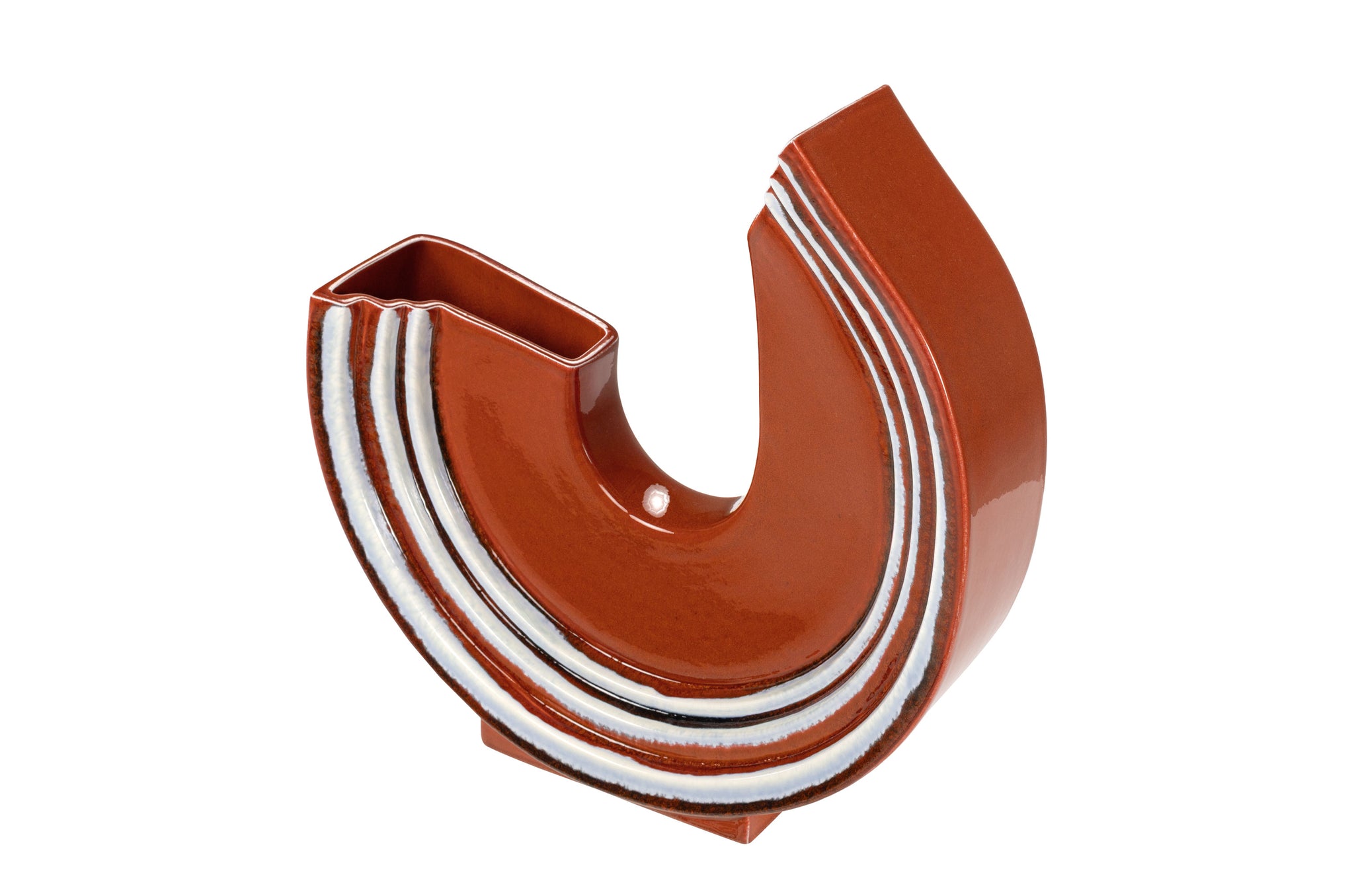 Vaas Margot van Vermissen is een speels vormgegeven aardewerken vaas in een warme terracottatint, afgewerkt met karakteristieke witgeregen lijnen. Door het gebruik van een reactieve glazuurlaag ontstaat bij elk stuk een uniek patroon met subtiele variaties in kleur en textuur.