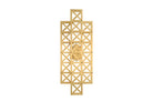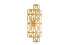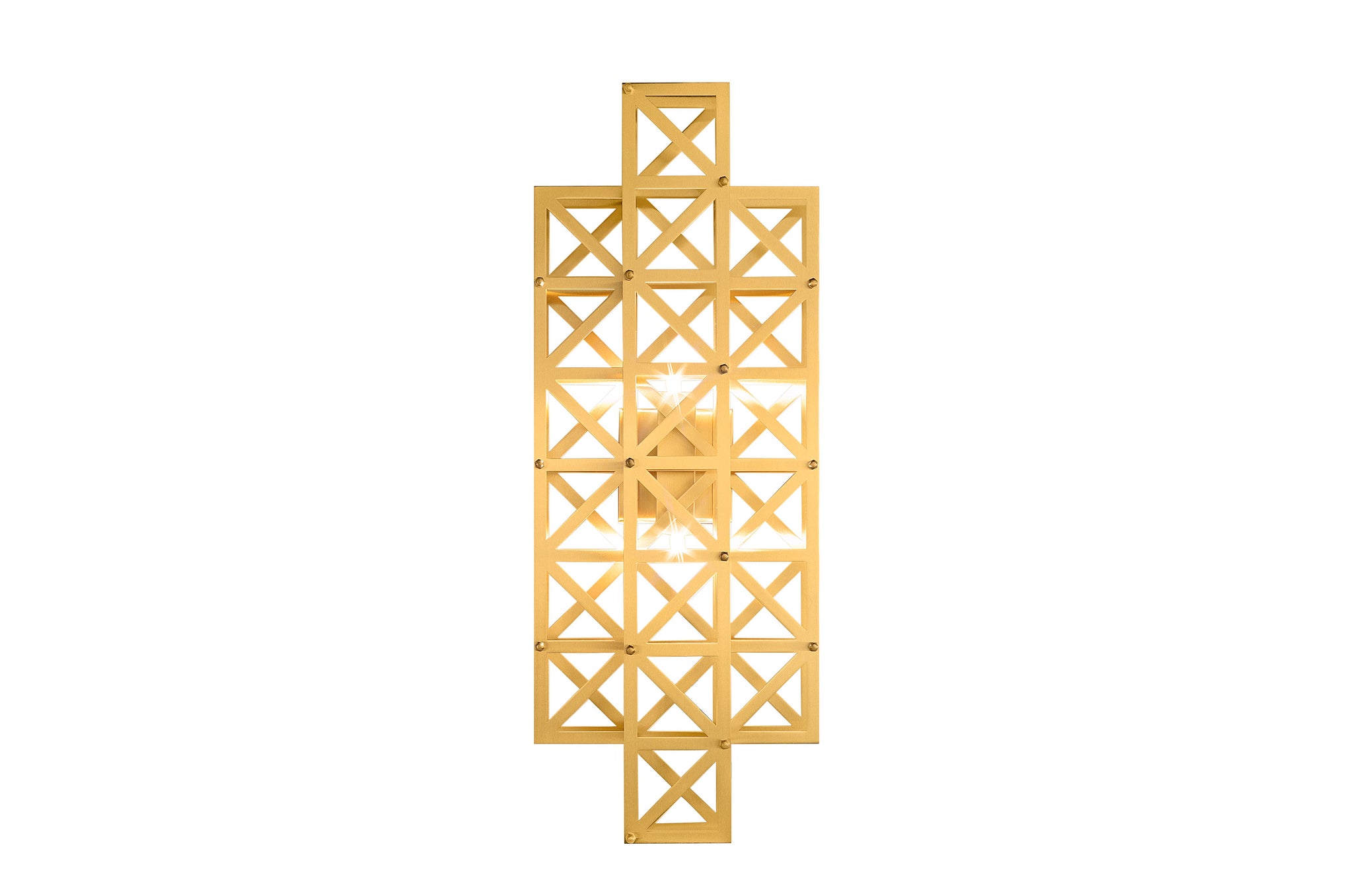 De wandlamp Pontes van Versmissen is uitgevoerd in massief messing en afgewerkt in een brushed brass finish. Het geometrische raster vormt een open structuur, waardoor het licht gefilterd en gelijkmatig wordt verspreid.