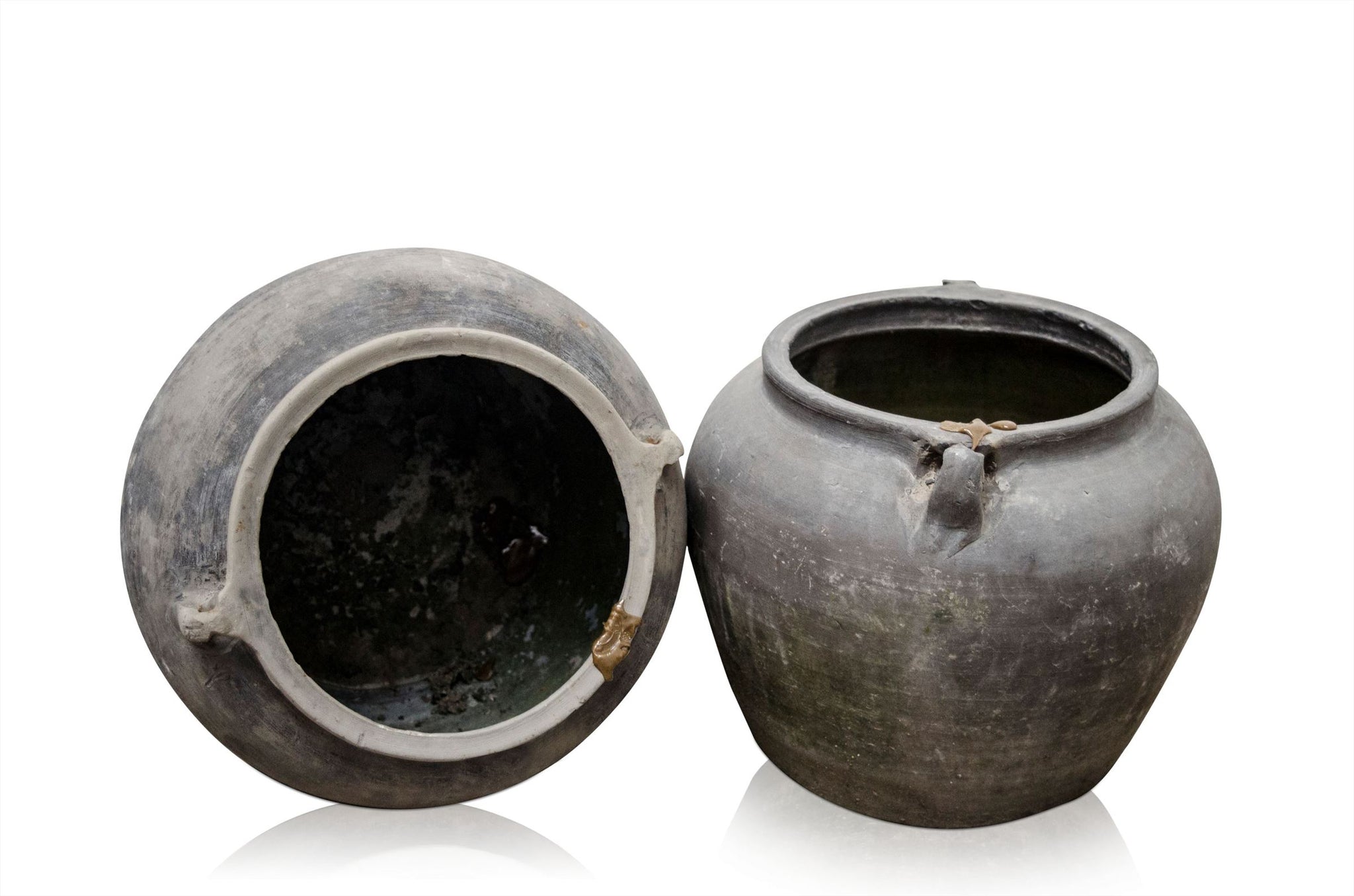 Deze antieke terracotta potten uit Shanxi zijn circa 120 jaar oud en werden oorspronkelijk gebruikt als alledaagse gebruiksvoorwerpen. Het terracotta oppervlak toont natuurlijke sporen van ouderdom, zoals slijtage, kleine beschadigingen en onregelmatigheden, passend bij de leeftijd en het oorspronkelijke gebruik.