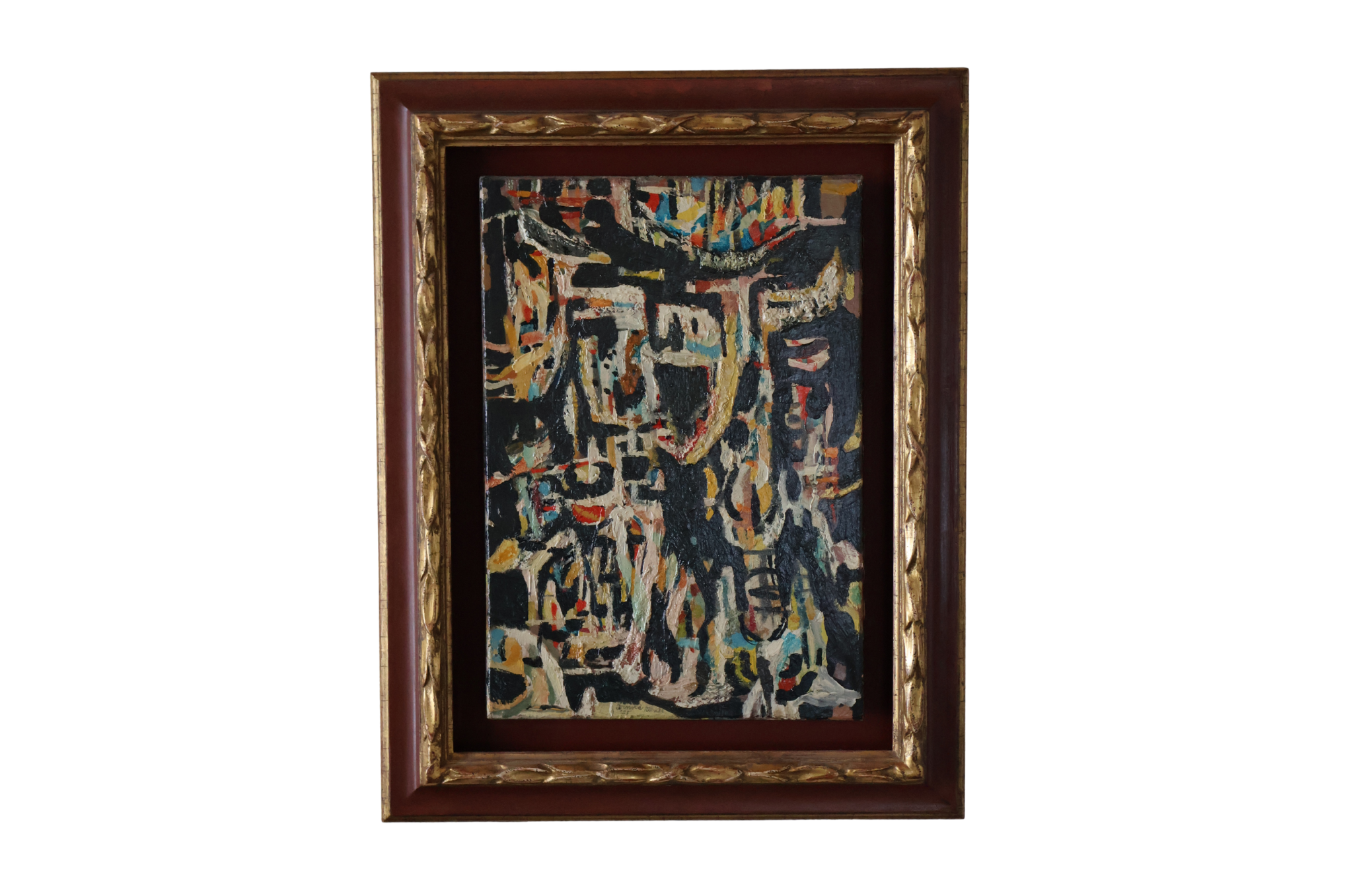 De compositie wordt gekenmerkt door een expressieve, gelaagde verfstructuur en een krachtig kleurgebruik, waarin donkere partijen worden doorbroken door accenten in oker, wit en rood. De voorstelling is niet figuratief maar suggereert beweging en ritme, typerend voor de naoorlogse abstracte schilderkunst in Nederland.