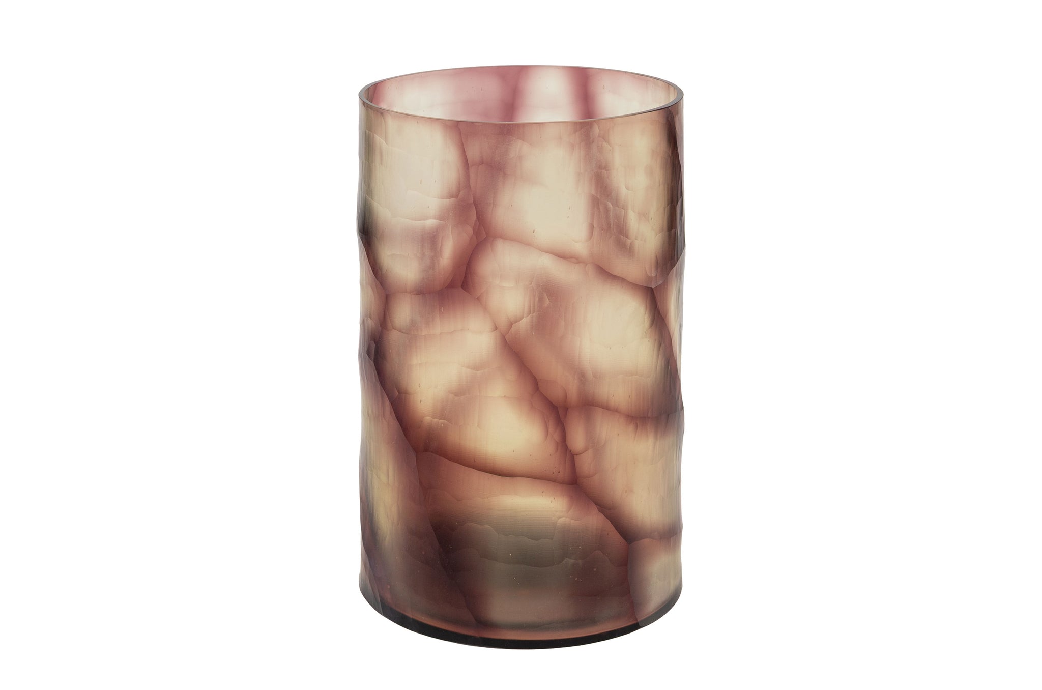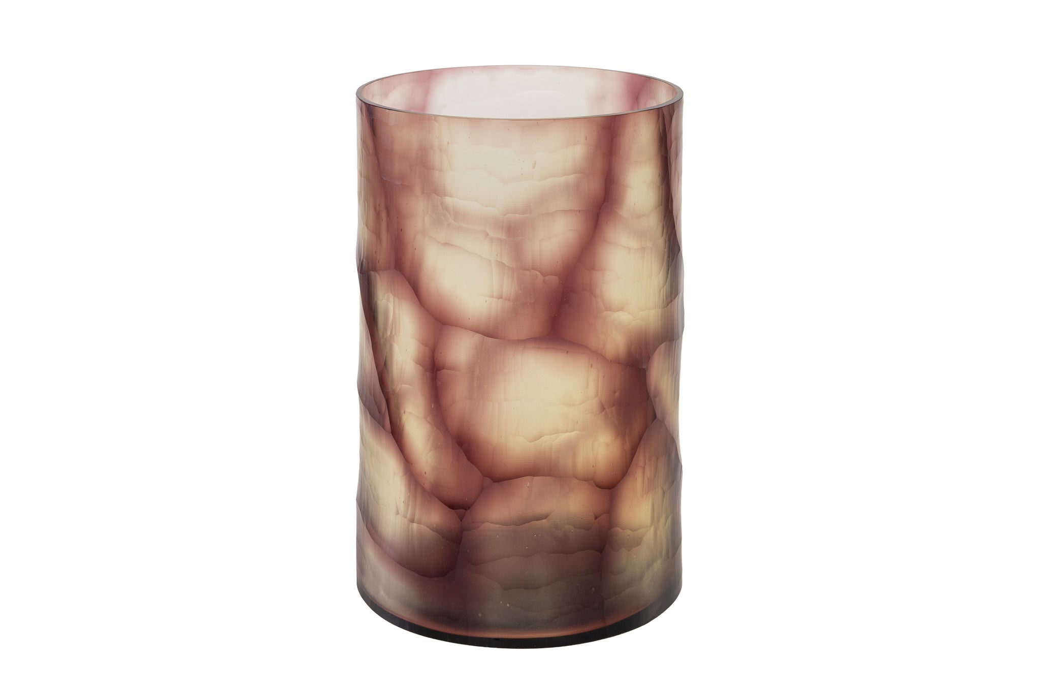 Deze cilindervaas van Vermissen heeft een zachte, omhullende uitstraling dankzij het gemarmerde kleurspel van diep paars, amber en transparante nuances. Het massief gekleurde glas is mondgeblazen en met de hand afgewerkt door ervaren glaskunstenaars, waardoor de vaas een subtiele gelaagdheid en een warm, bijna gloeiend effect krijgt.