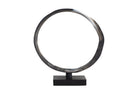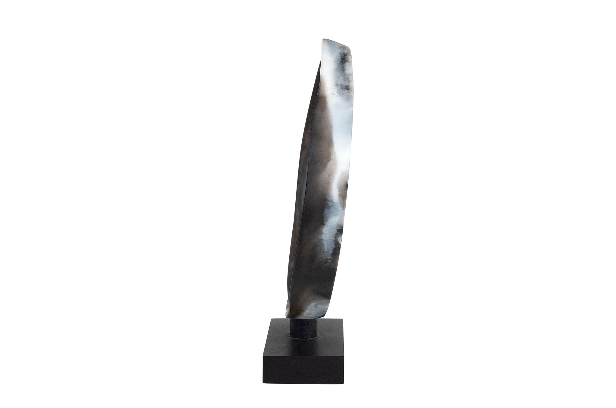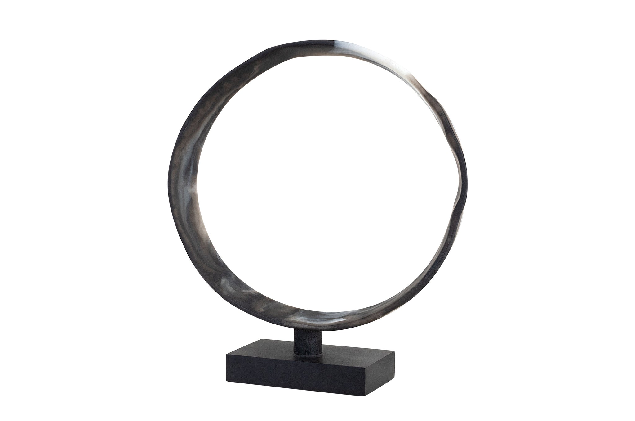 Geplaatst op de zwarte voet staat de cirkel licht en helder in de ruimte. Mooi op een dressoir, console of side table, waar het sculptuur een subtiel grafisch accent toevoegt zonder de omgeving te domineren.