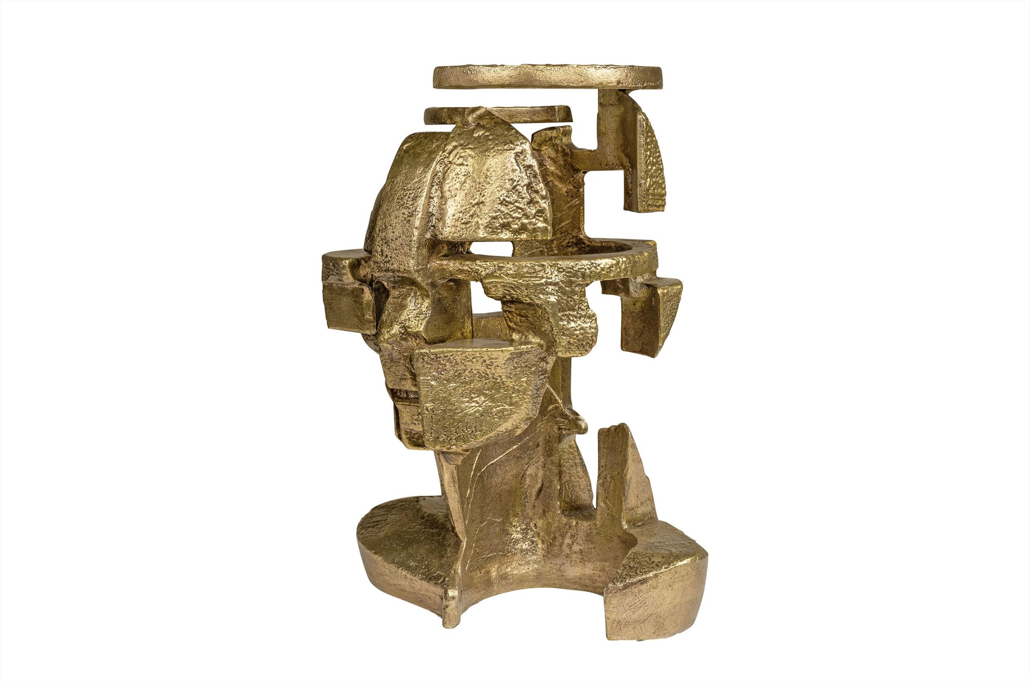 Sculptuur Savage Buste van Vermissen is gemaakt van aluminium en afgewerkt in een warme bronzen tint die diepte en karakter geeft aan de abstracte vorm. De buste bestaat uit stevige, geometrische vlakken die samen een krachtig silhouet vormen. Door de gelaagde opbouw ontstaat een spel van lijnen en schaduwen dat het object direct aanwezigheid geeft.