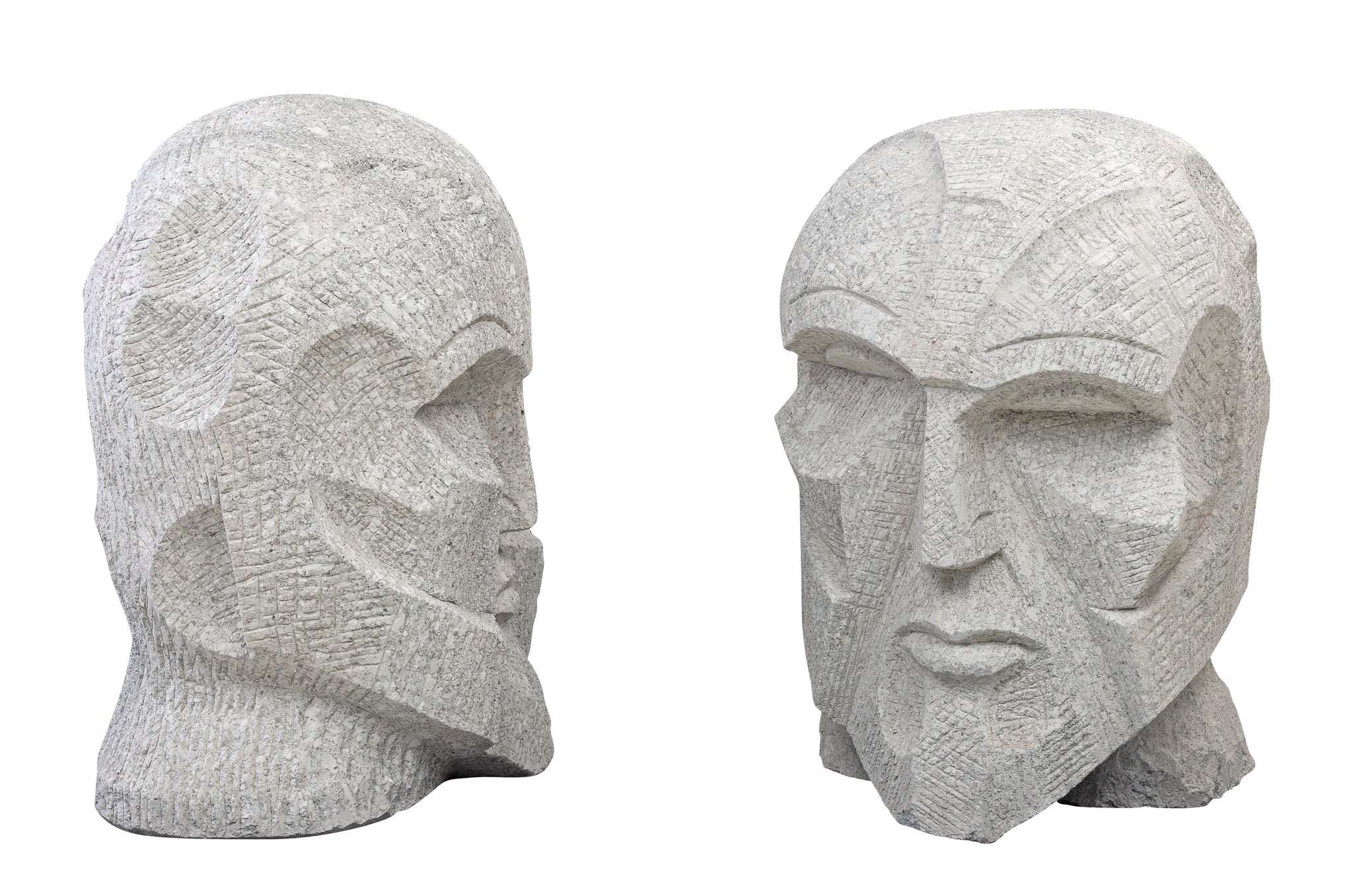 Deze grotere sandstone sculptuur van Vermissen heeft een krachtige, bijna monumentale uitstraling. Het geometrisch gevormde gezicht en de grove korrelstructuur benadrukken de robuuste schoonheid van natuursteen. De rustige grijstinten en subtiele schaduwlijnen geven het hoofd een statige, bijna meditatieve aanwezigheid.